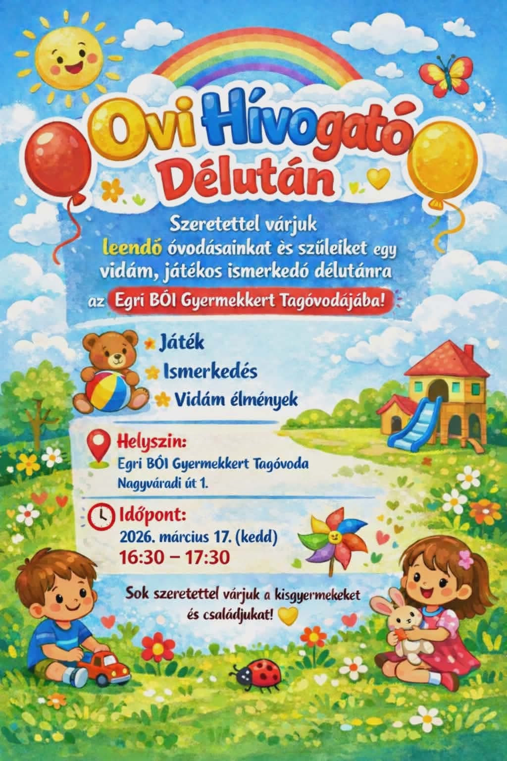 Ovi Hívogató Délután Szeretettel várjuk leendő óvodásainkat és szüleiket egy vidám, játékos ismerkedő délutánra az Egri BÓI Gyermekkert Tagóvodájába!